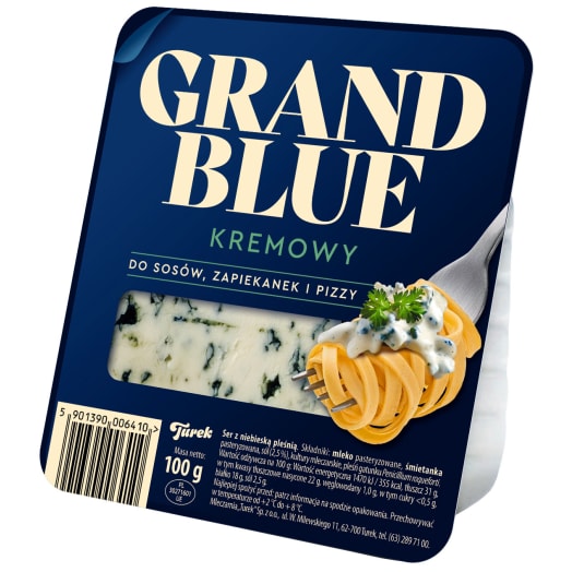 Ser Kremowy z niebieską pleśnią Grand Blue marki Turek doskonale się topi, oddając tym samym głębię swojego smaku do potrawy. Można nim doprawić sos serowy, makaron, świetnie sprawdza się także na pizzy i zapiekankach. Ser pleśniowy jest miękki, kremowy i ma piękny marmurkowy rysunek niebieskich pleśniowych oczek.